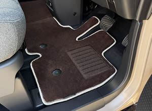 乗車スペース(車1台分)のフロア面をカバーする、フロアの形状に合わせた専用設計。運転時に左足を置くスペース、「フットレスト部」までカバーする形状。 乗降の際に傷や汚れが付きやすい2列目ステップマット付きになります。 運転席マットは、車体に標準装備されている専用留め具に対応するグロメットを装着いたします。